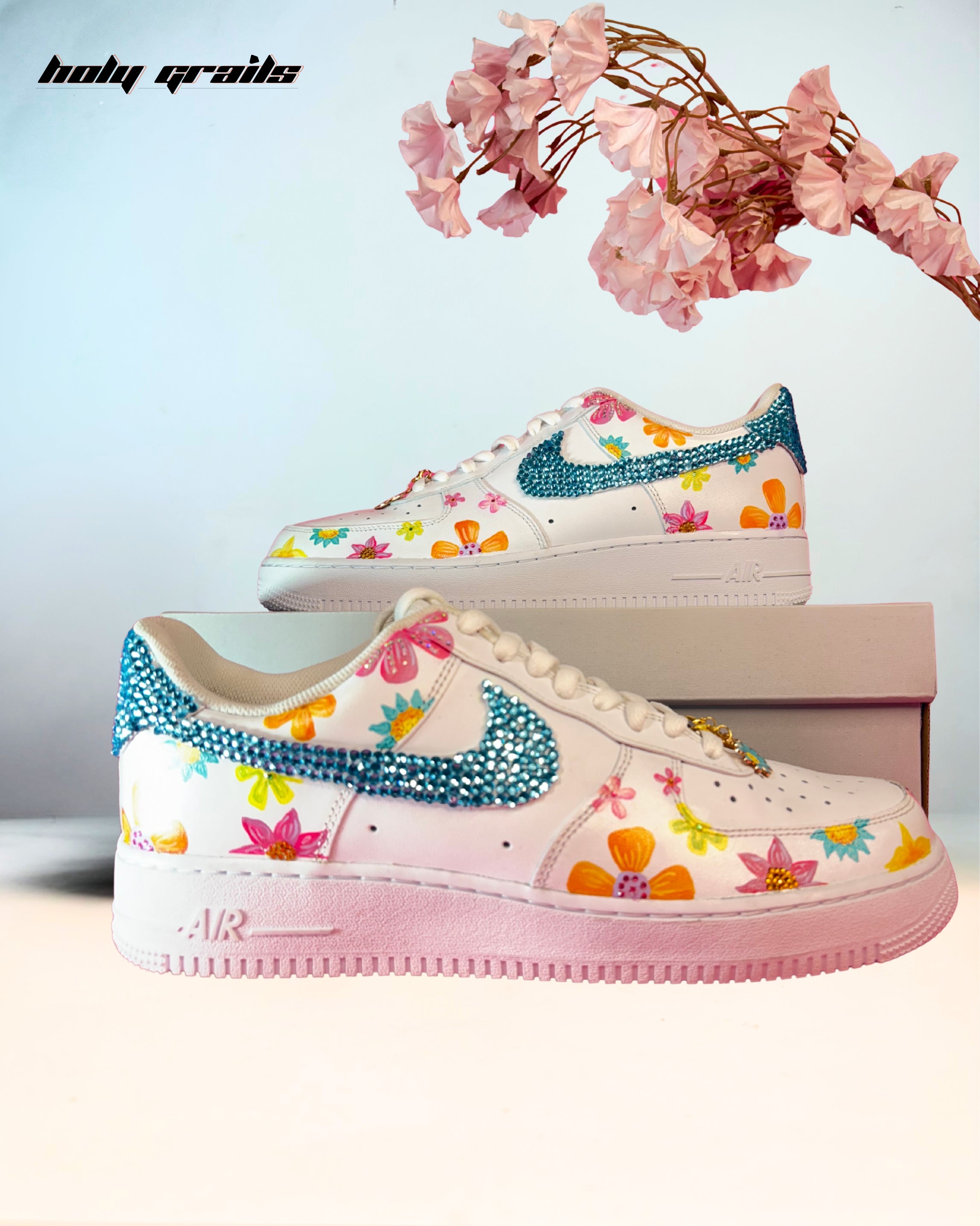 Say hello to Fling Bling, the sneakers that flirt with fun and shine with attitude. We’ve taken the iconic crisp-white AF1 base and turned it into a statement piece that literally glows. A dreamy burst of hand-painted florals blooms across the shoe, giving it a soft, playful “fling” energy. And for the bling? The signature Swoosh is transformed with aqua-blue rhinestones, each hand-placed to create a sparkling, jewelry-like finish that catches every eye.
