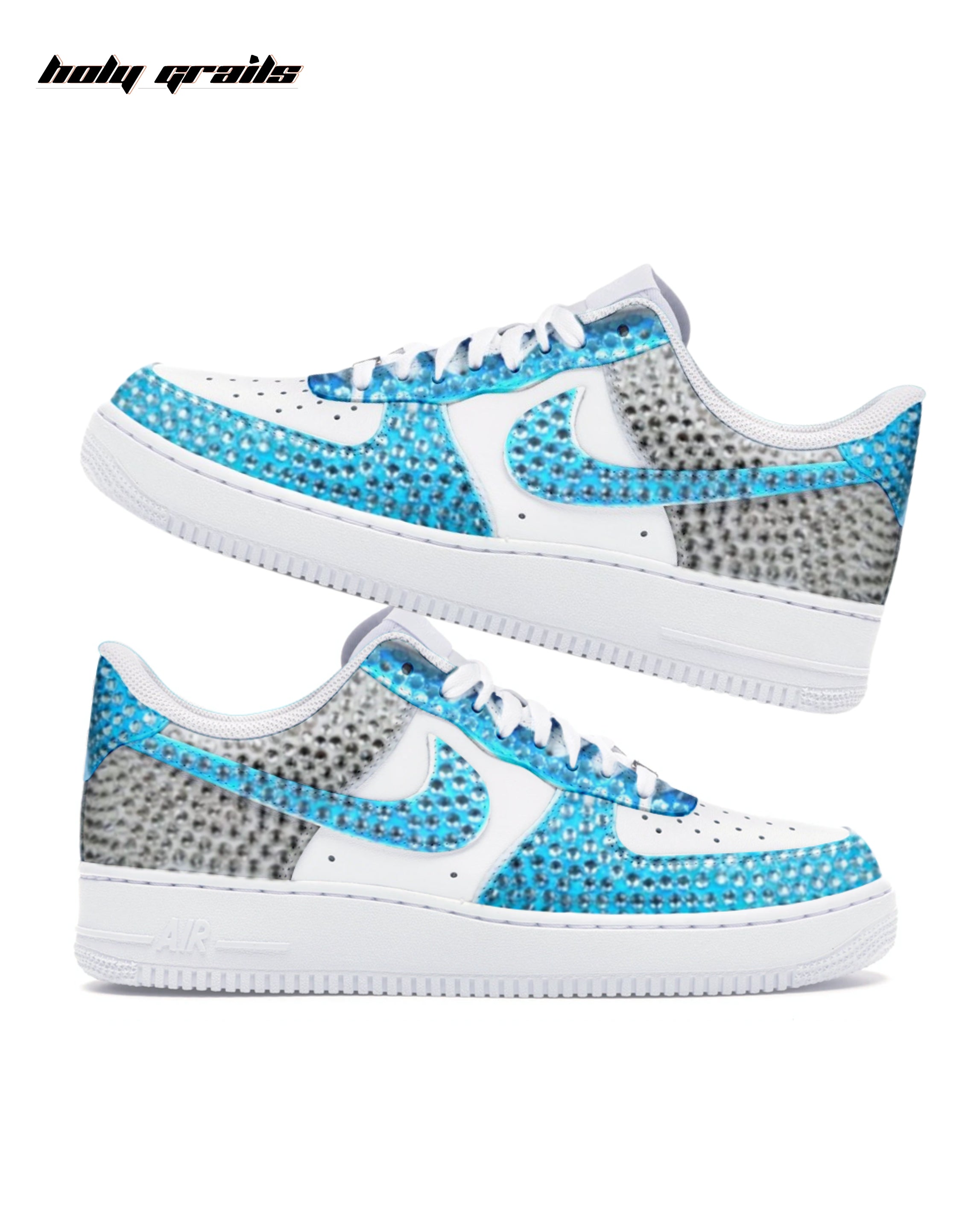 Fresh, clean, and absolutely brilliant. The "Sky Blue Glaze" features vibrant blue crystals outlining the contours, contrasted by clear, icy rhinestones for maximum light reflection. Each rhinestone is precisely hand pasted on the sneaker. A refreshing and dazzling twist on a classic.