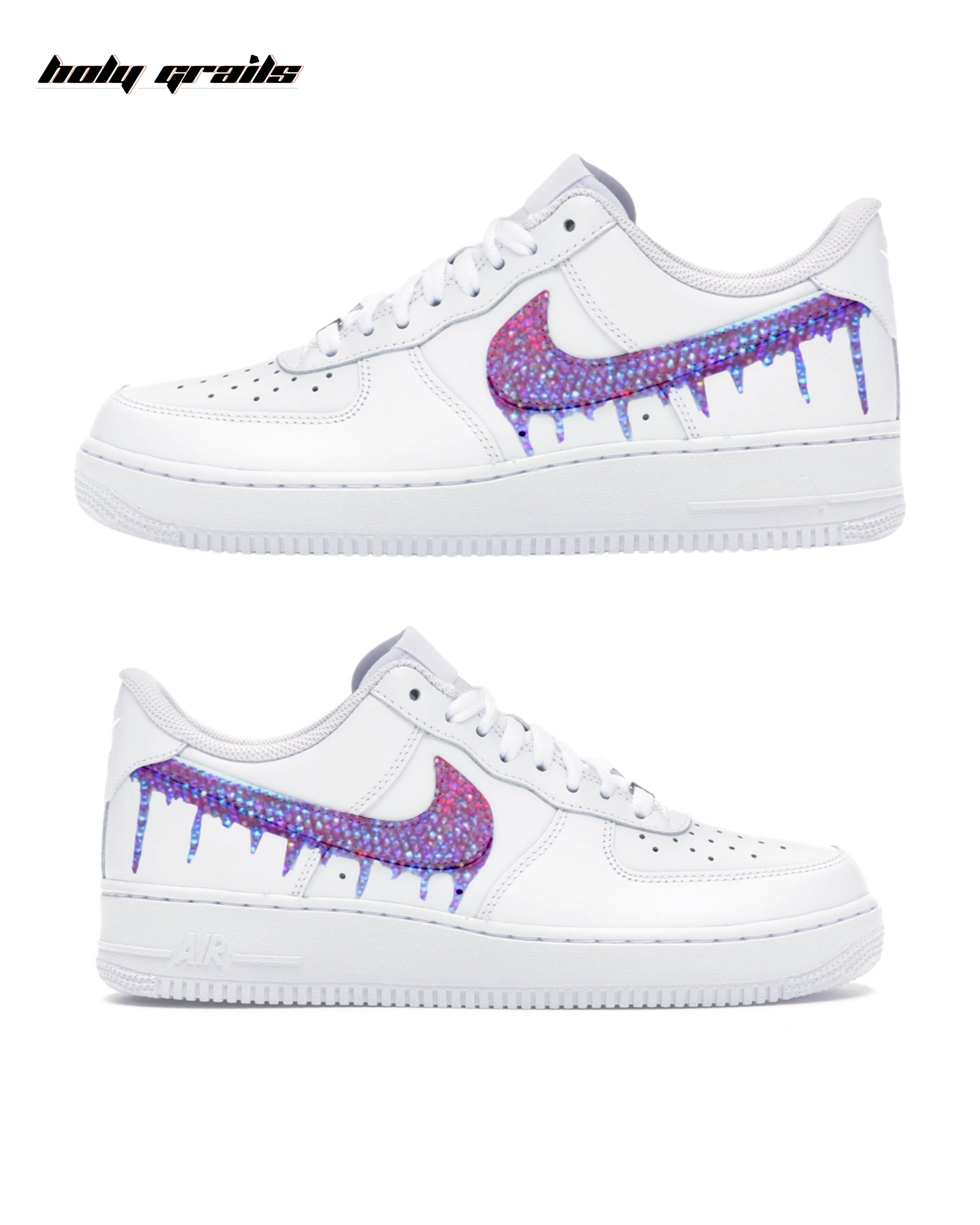 The freshest custom kicks on the block! "Slushie Swag" features a dynamic pink, purple, and blue crystal design that melts down the side of the sneaker. The ultimate icy, vibrant, and fun statement piece for those who love color. A vibrant, kinetic, and utterly unique take on the classic sneaker silhouette.