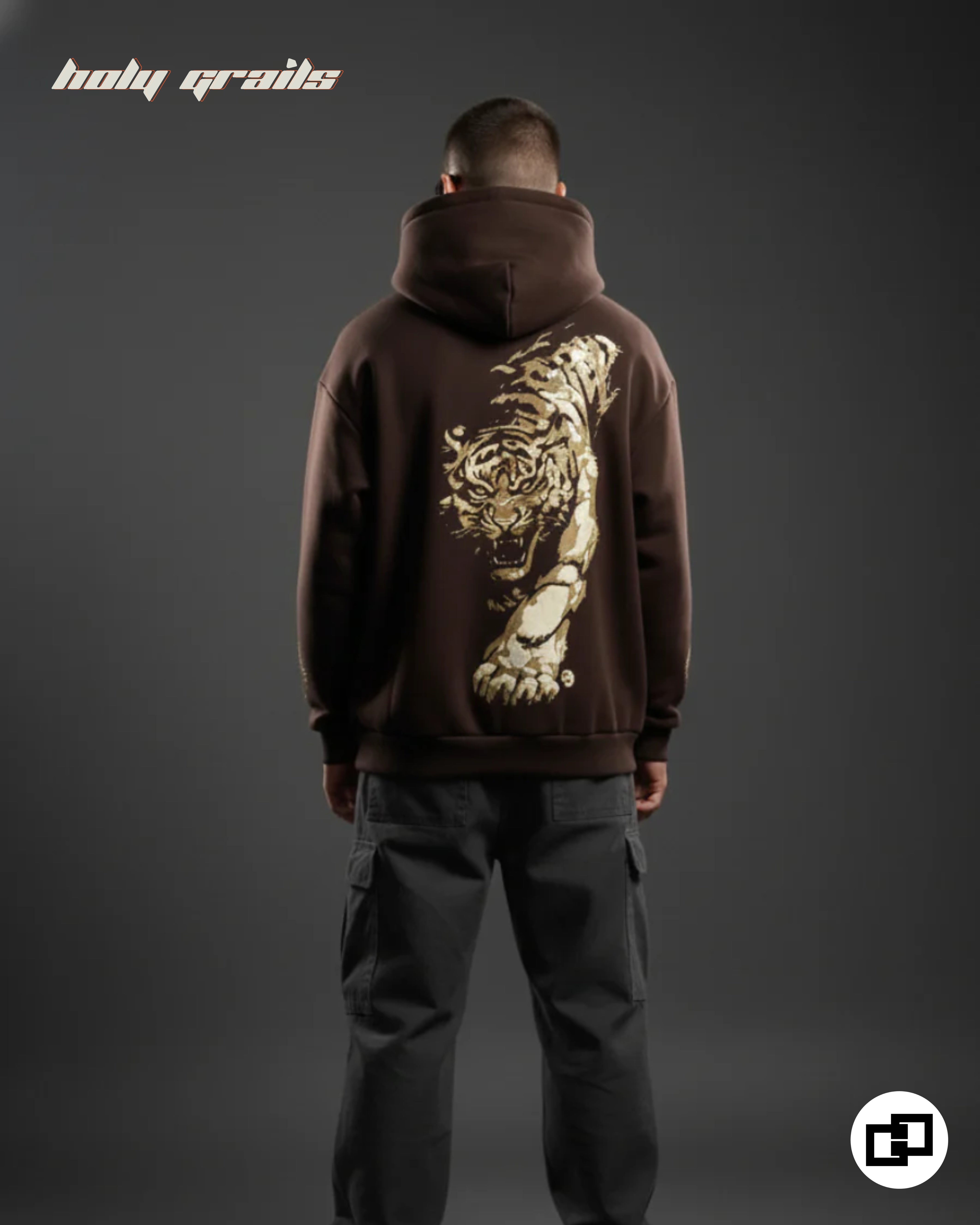 Tiger Claw Hoodie is rendered in a rich, versatile chocolate brown hue. This oversized fleece piece makes an immediate statement with its intricate detailing. Across the back, a highly detailed, fierce gold tiger graphic cascades down the spine, creating a stunning visual flow that demands attention. The brand's identity is reinforced on the front with the "Greyhound Originals" logo presented in matching metallic gold script. Designed for high-impact street style, this hoodie perfectly marries superior comfort with an edgy, predatory aesthetic.