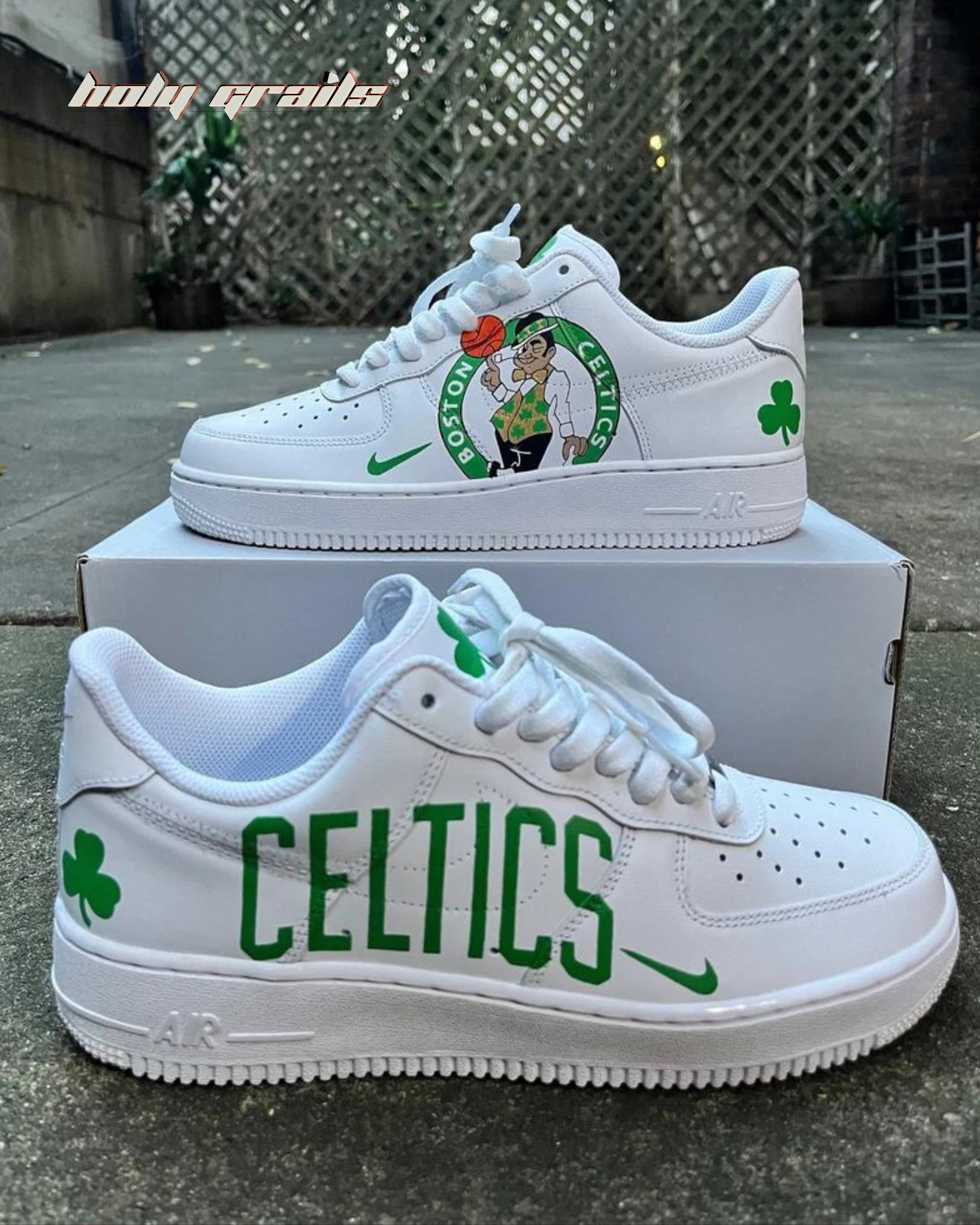 Celebrate your team spirit with the Celtics custom Air Force 1 sneakers. These classic white shoes are revamped with the vibrant green and iconic Boston Celtics logo on one side, and bold "CELTICS" lettering on the other. Accented with cloverleaf details, these sneakers merge style and loyalty, providing a perfect blend of fashion and fandom. Ideal for game days or casual wear, this unique design ensures you showcase your Celtics pride with every step.