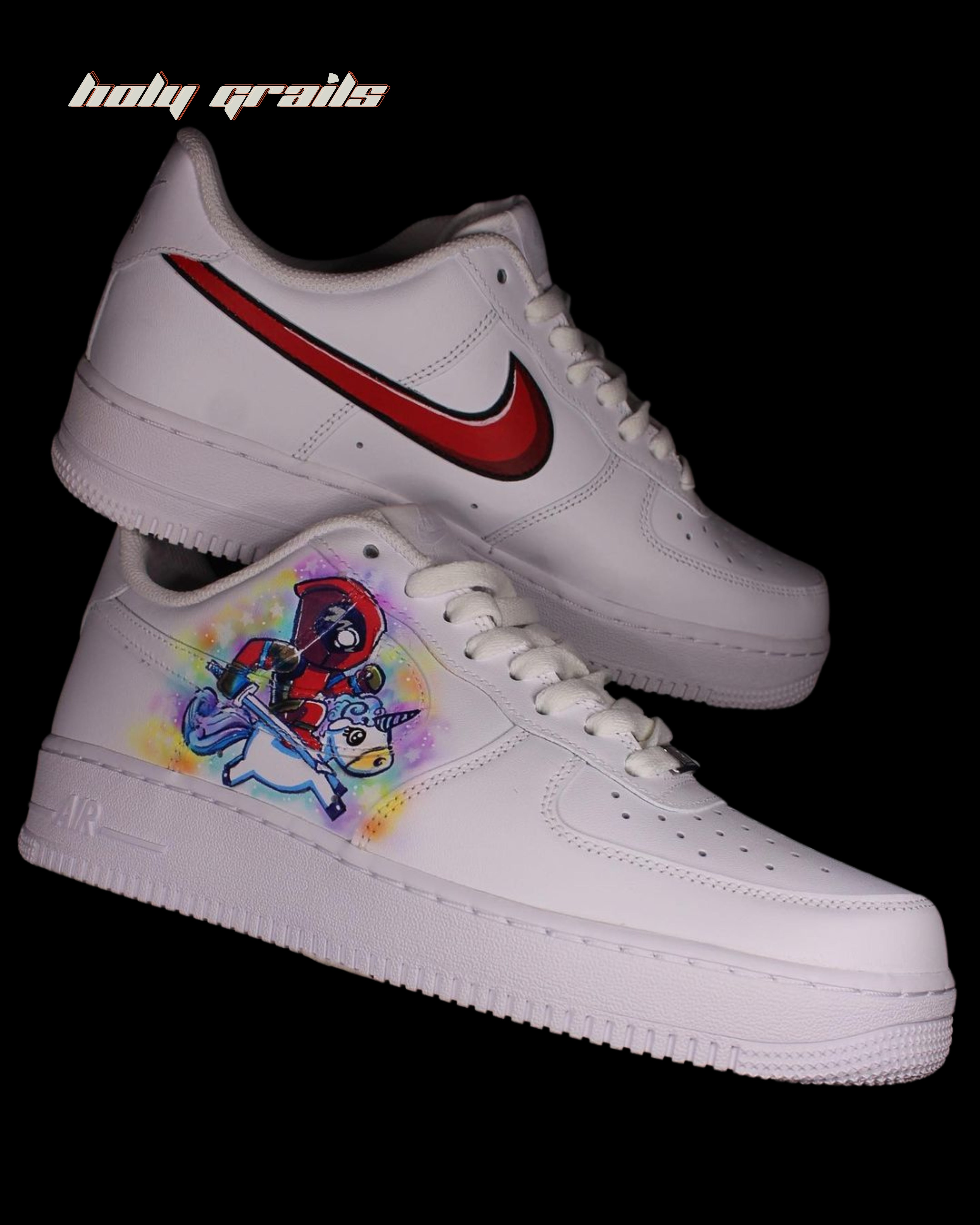 Presenting our customised Air Force 1s, designed for the fitness enthusiast with a dash of superhero style! These sneakers are powerful and inspiring, with vibrant Deadpool graphics that stand out against the busy gym environment. The recognisable red swoosh represents power and resolve, while Deadpool's skillful grasp of a barbell encourages you to do new things.