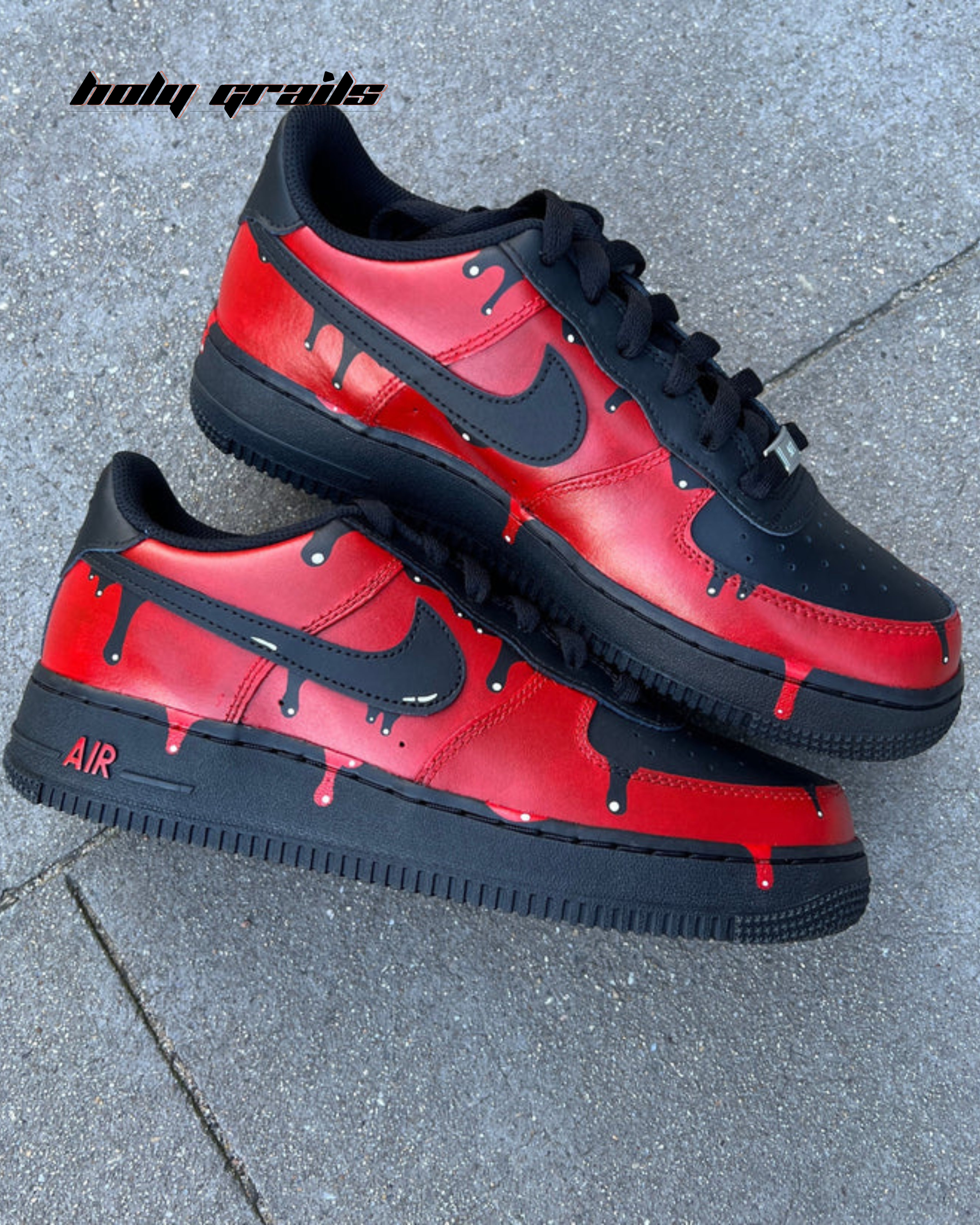 These custom Nike Air Force 1s feature a bold red upper and a striking black drip-effect Swoosh. The handcrafted design adds an artistic flair to the classic silhouette, while the black accents and red details create a dynamic contrast. Perfect for making a bold fashion statement, these sneakers combine unique style with the renowned comfort and durability of Nike Air Force 1.