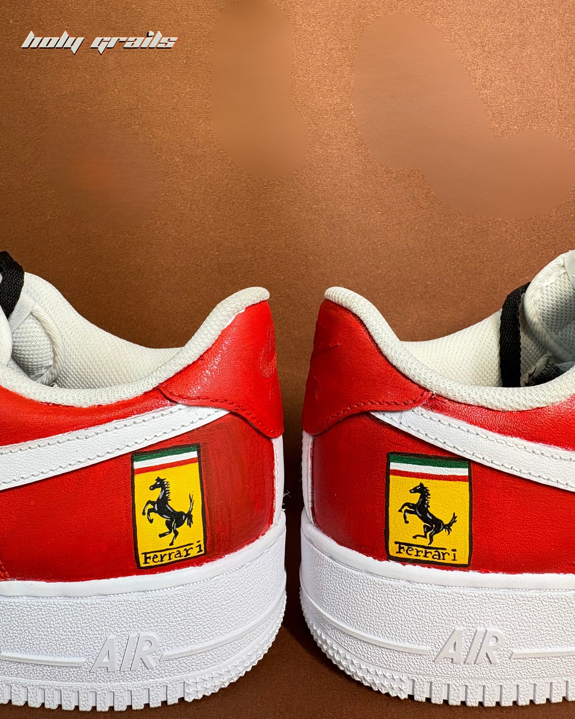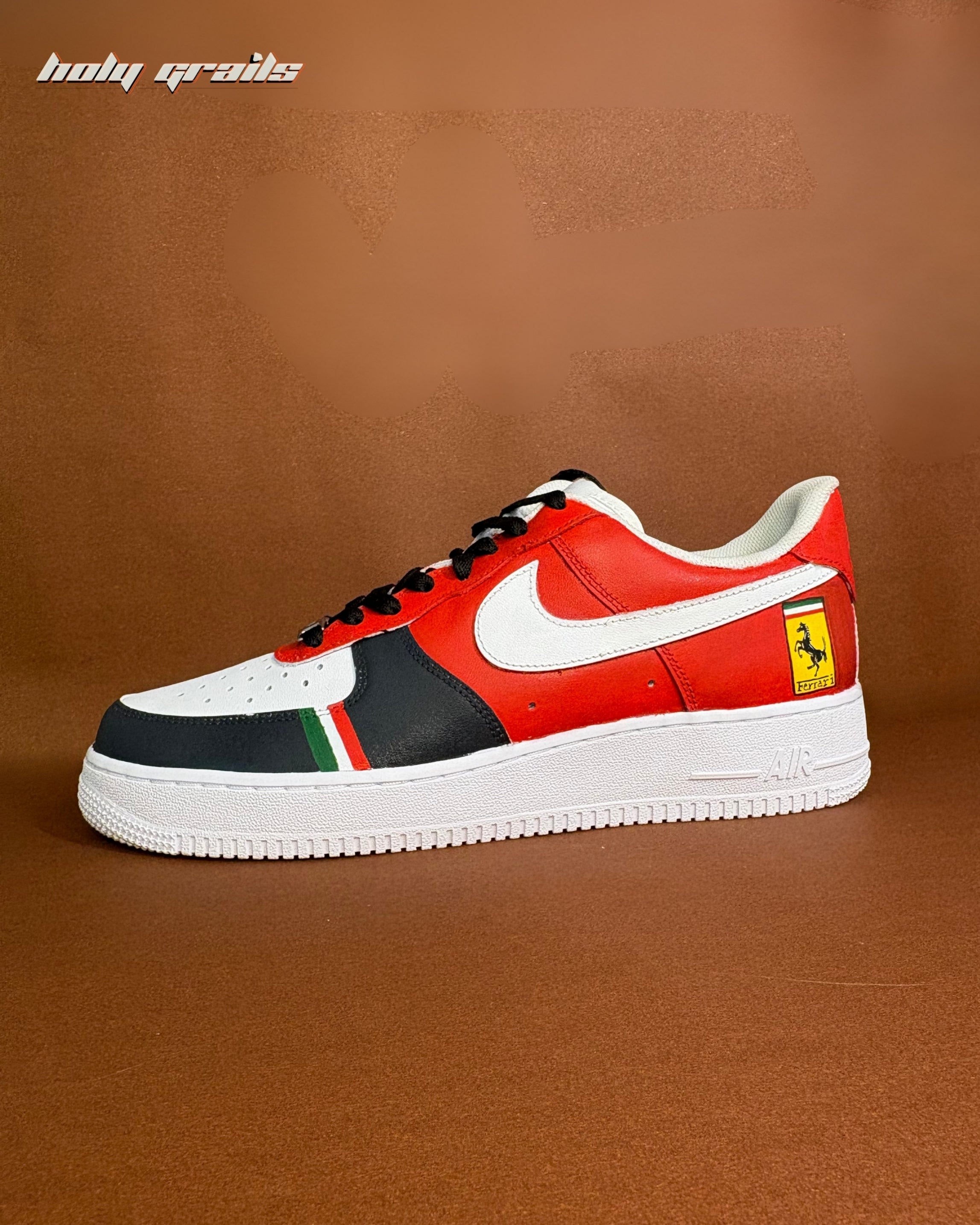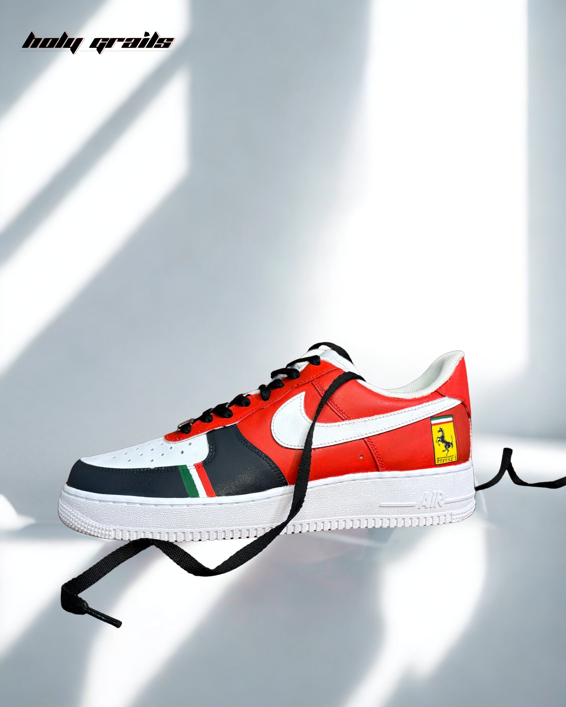 Our customized Ferrari-themed Air Force 1 sneaker will unleash your inner speed demon. These famous sneakers, hand-painted in eye-catching Ferrari red, feature the legendary Ferrari insignia, combining style and performance. Each pair is precisely created to encapsulate the aura of luxury and speed, making them ideal statement pieces for both automobile fans and fashion-forward individuals.