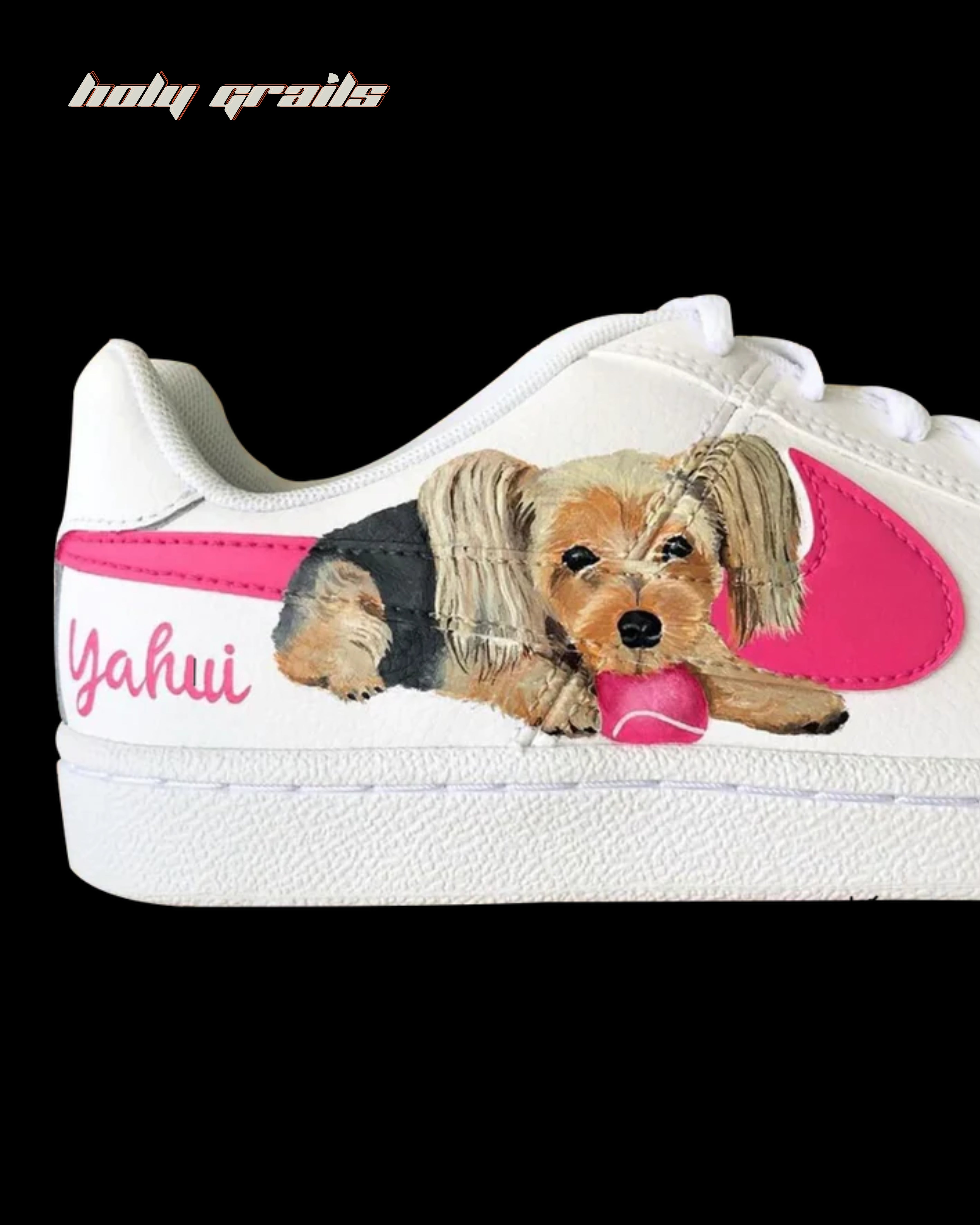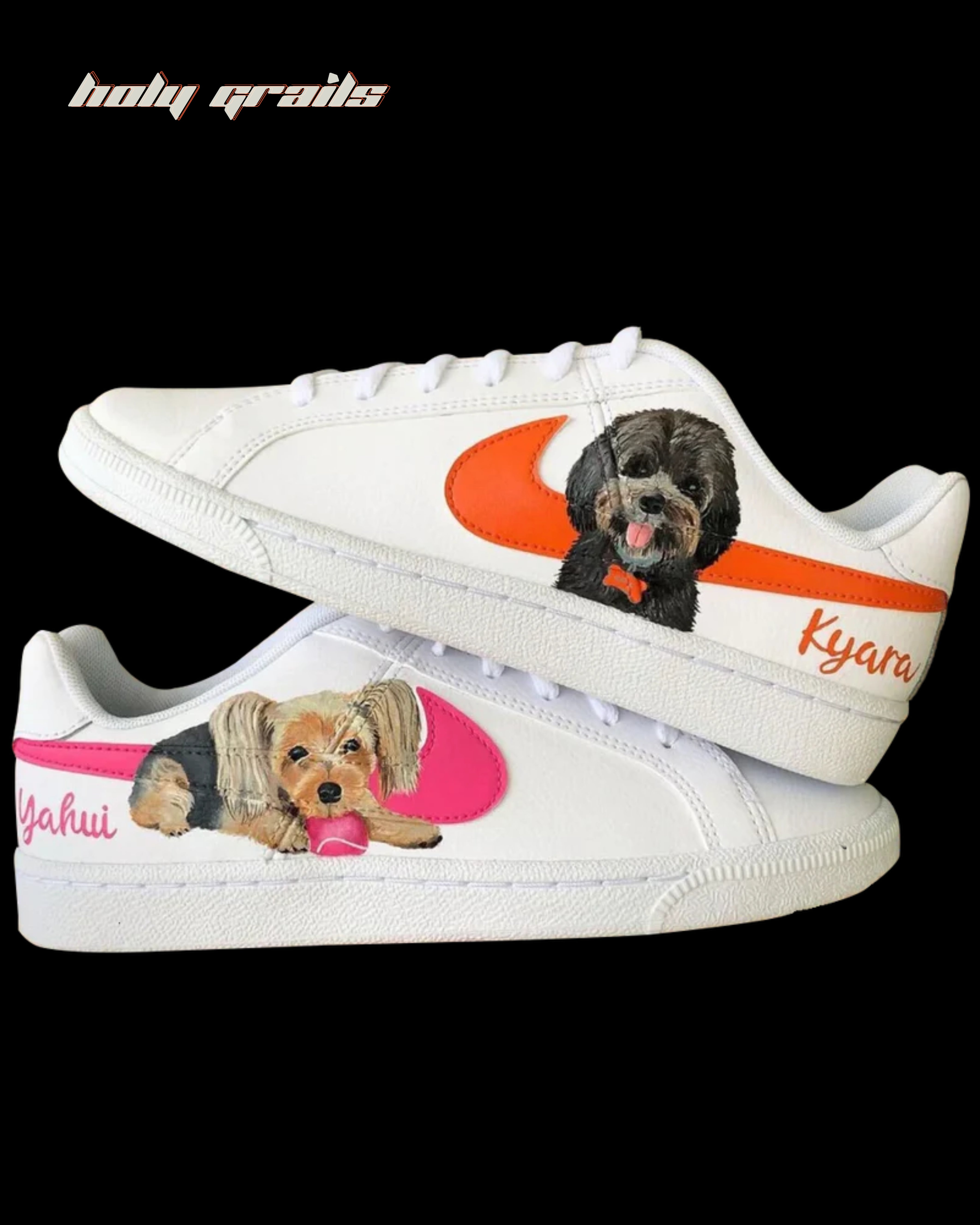 These custom Nike kicks, features personalized pet portraits! Each shoe showcases a hand-painted image of your furry friend, making them a unique and stylish tribute to your beloved pet. Crafted for comfort and durability, these sneakers come with vibrant swoosh colors and personalized names to match your pet's personality. Perfect for pet lovers who want to carry a piece of their pet's charm wherever they go. Make your footwear truly one-of-a-kind!