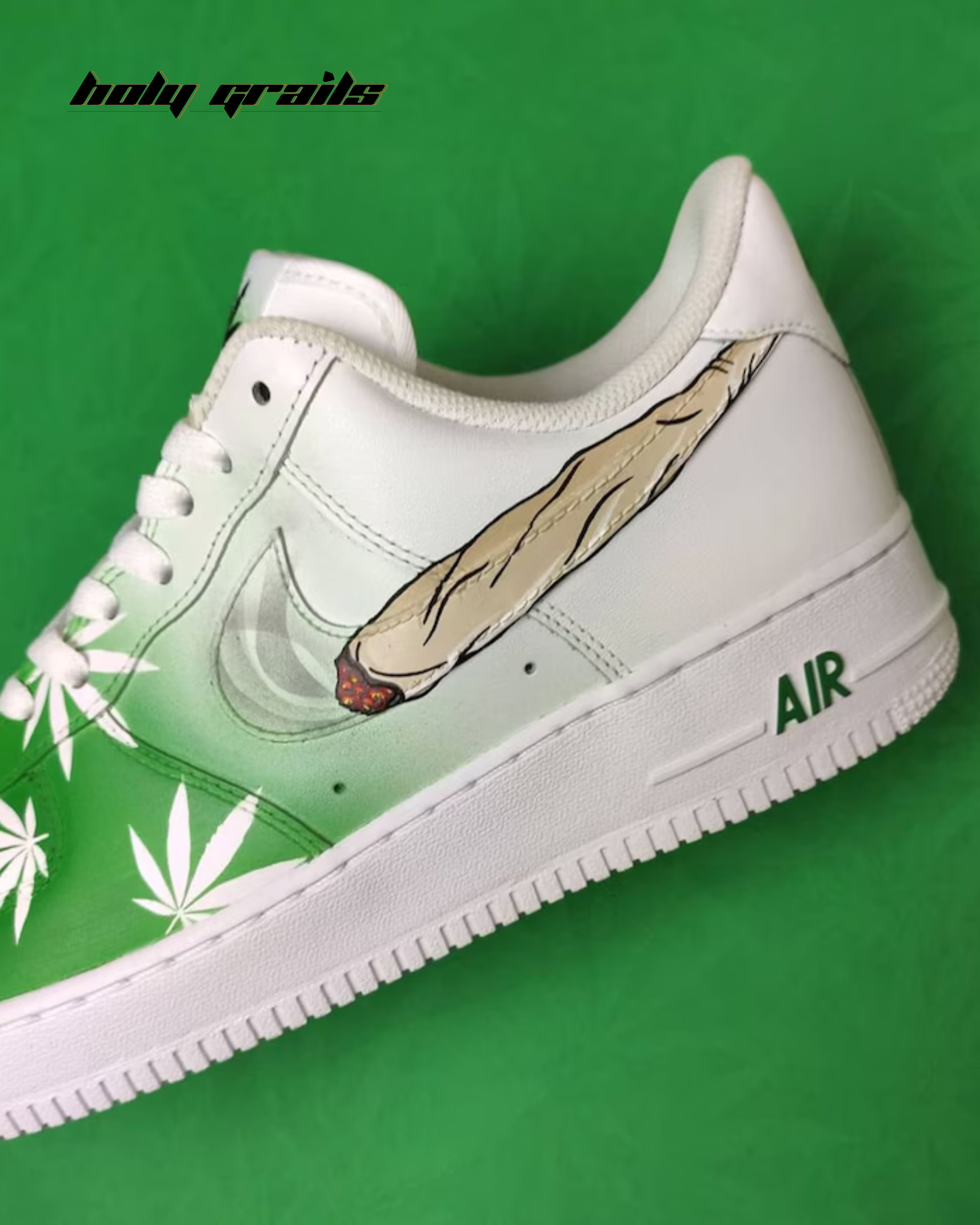 Custom Nike Air Force One sneaker, adorned with eye-catching joint themed designs, features a detailed illustration of hands passing a lit joint and a striking green background filled with white cannabis leaves, these sneakers blend artistry and streetwear effortlessly. The bold graphics and vibrant colors make a powerful statement, perfect for those who appreciate unique, hand-painted footwear.