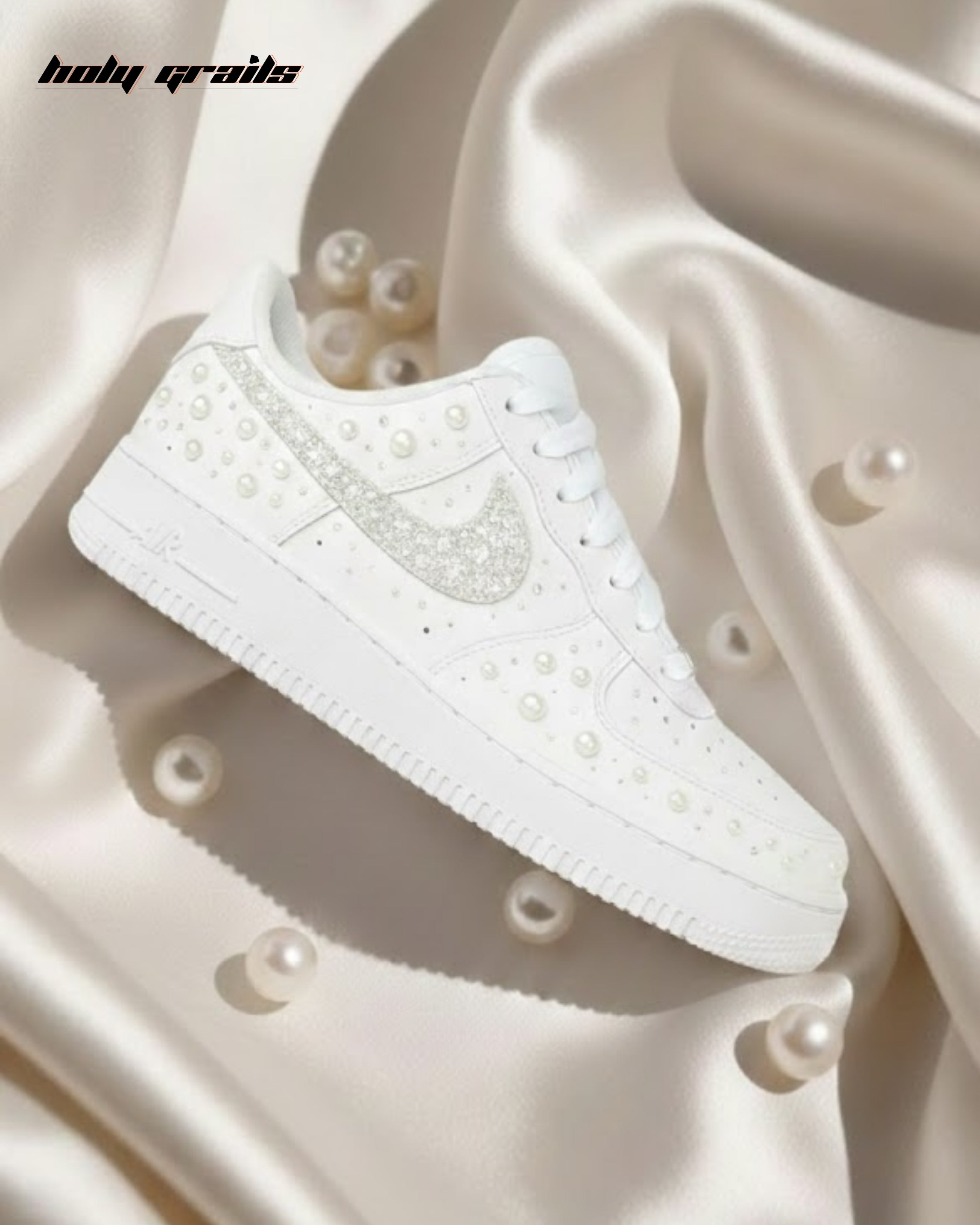 This iconic white sneaker is transformed with delicate, hand-applied embellishments. The Nike Swoosh is encrusted with brilliant, sparkling clear crystals, while the body of the shoe features a stunning arrangement of varying-sized pearls. This design offers a unique blend of street style and timeless sophistication. Perfect for celebrations, or anyone wanting a luxurious, feminine touch. They are the ultimate statement piece for elevated style.