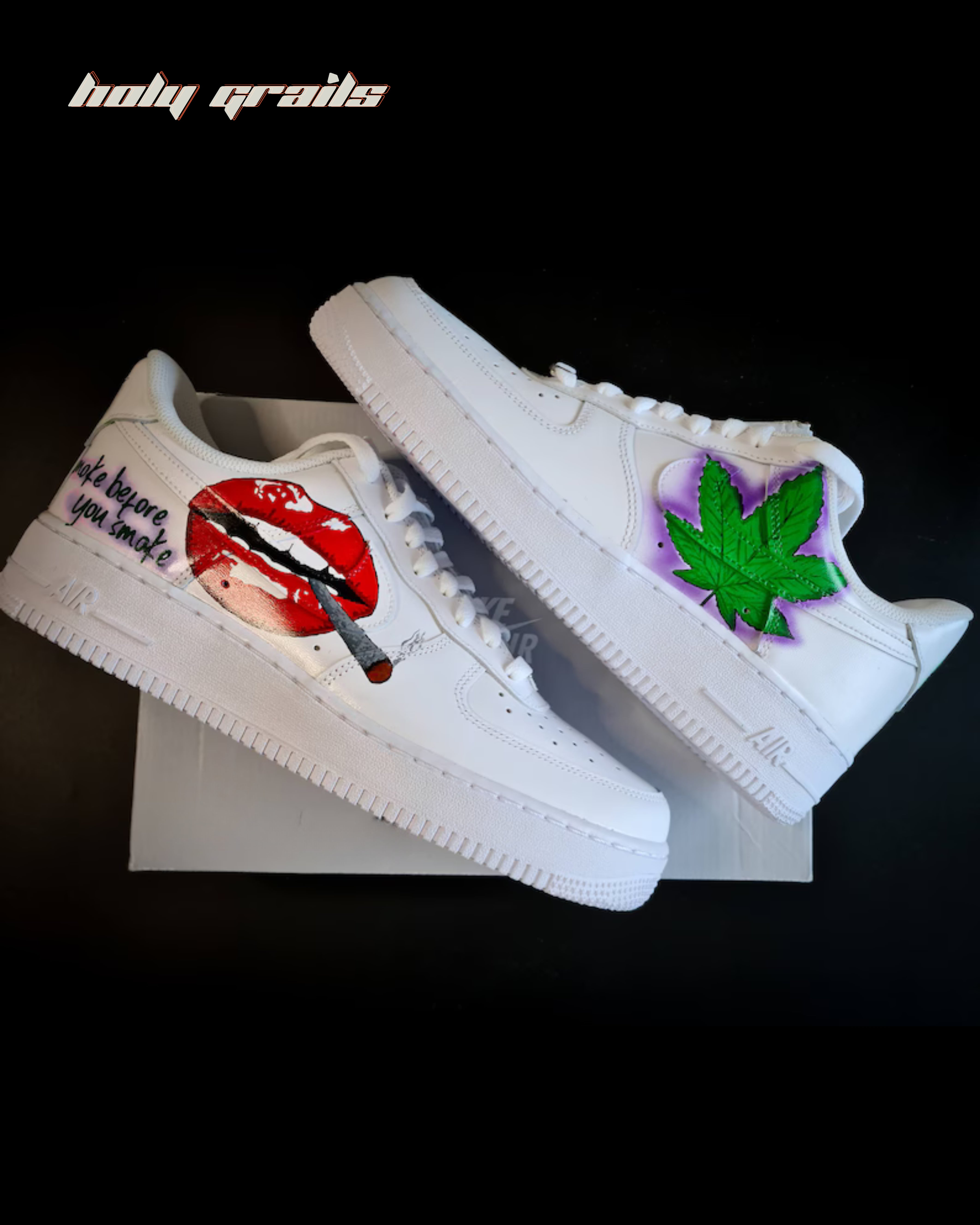 Our custom-designed Nike Air Force One sneakers feature vibrant weed-themed artwork. The right sneaker showcases a bold green marijuana leaf set against a striking purple background, while the left shoe features vivid red lips exhaling smoke with a message. These eye-catching, hand-painted designs offer a unique blend of art and streetwear, perfect for those who want to make a statement with their footwear.