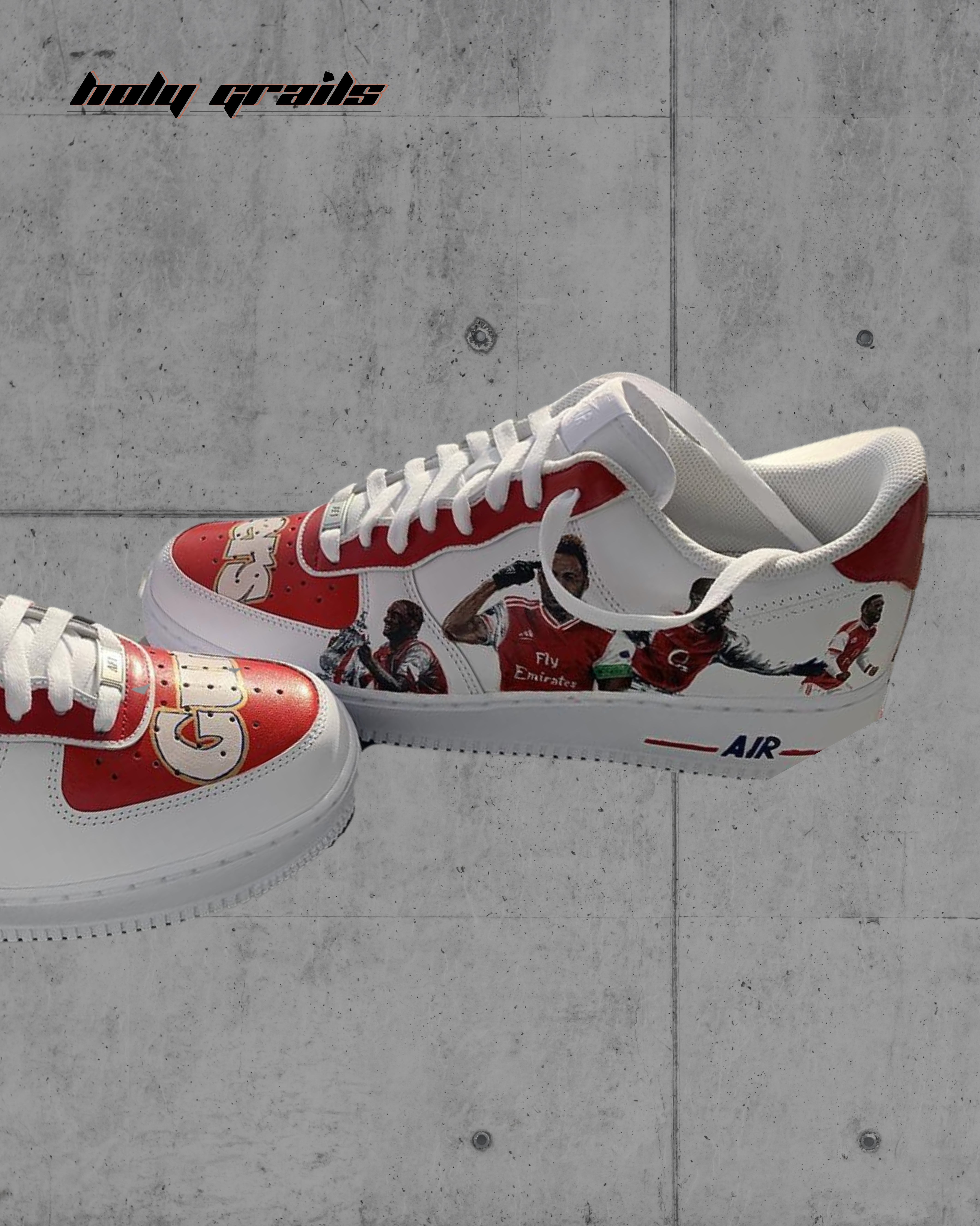 The spirit of Arsenal FC with our custom Air Force One sneakers feature the iconic Arsenal crest and vivid imagery of legendary players, these shoes celebrate the rich heritage of the Gunners. Crafted on the classic Air Force One silhouette, each pair combines premium quality with striking, fan-driven design. Perfect for any Arsenal enthusiast, these unique sneakers provide a stylish way to showcase your club loyalty both on and off the pitch. Go beyond support—wear your passion.