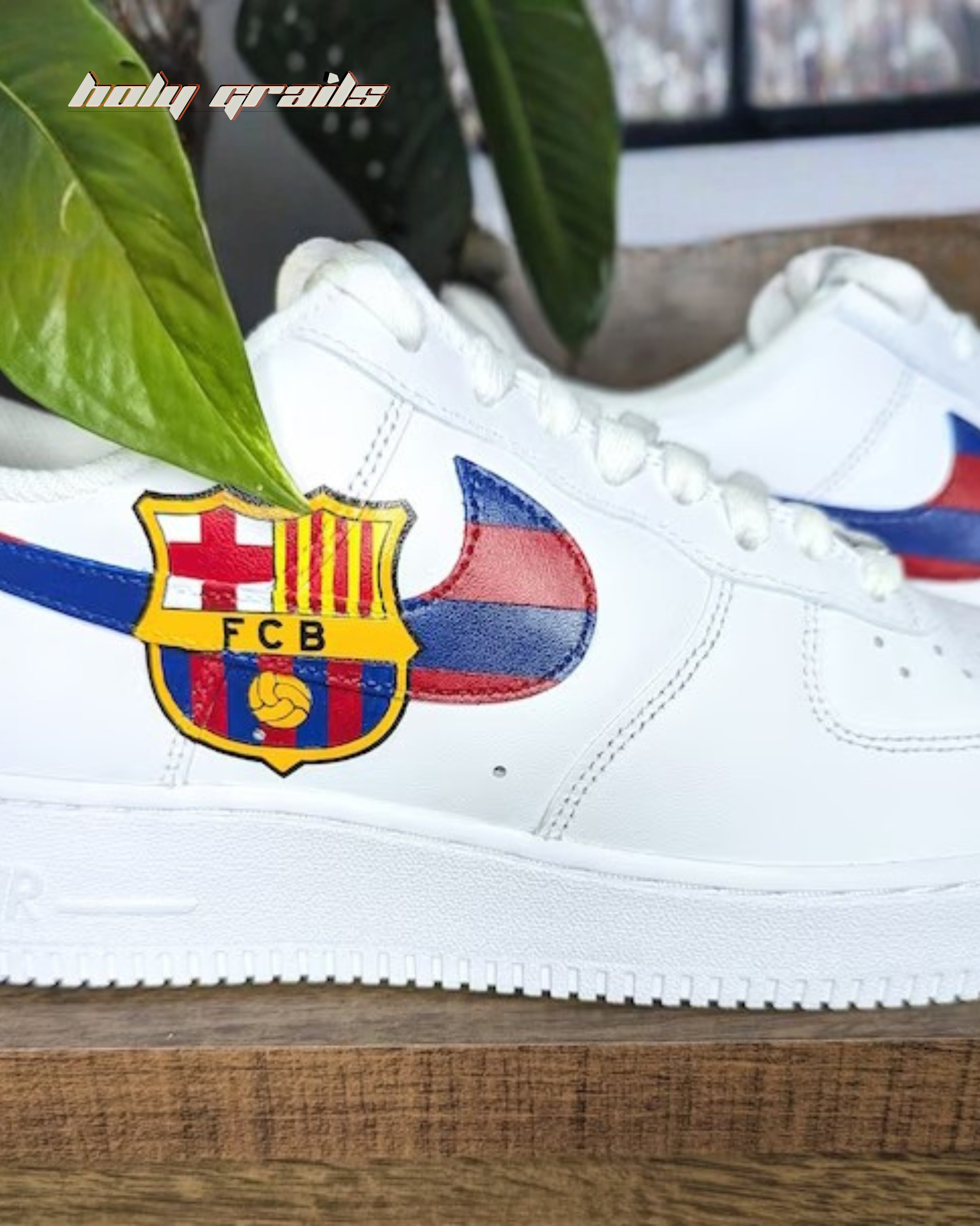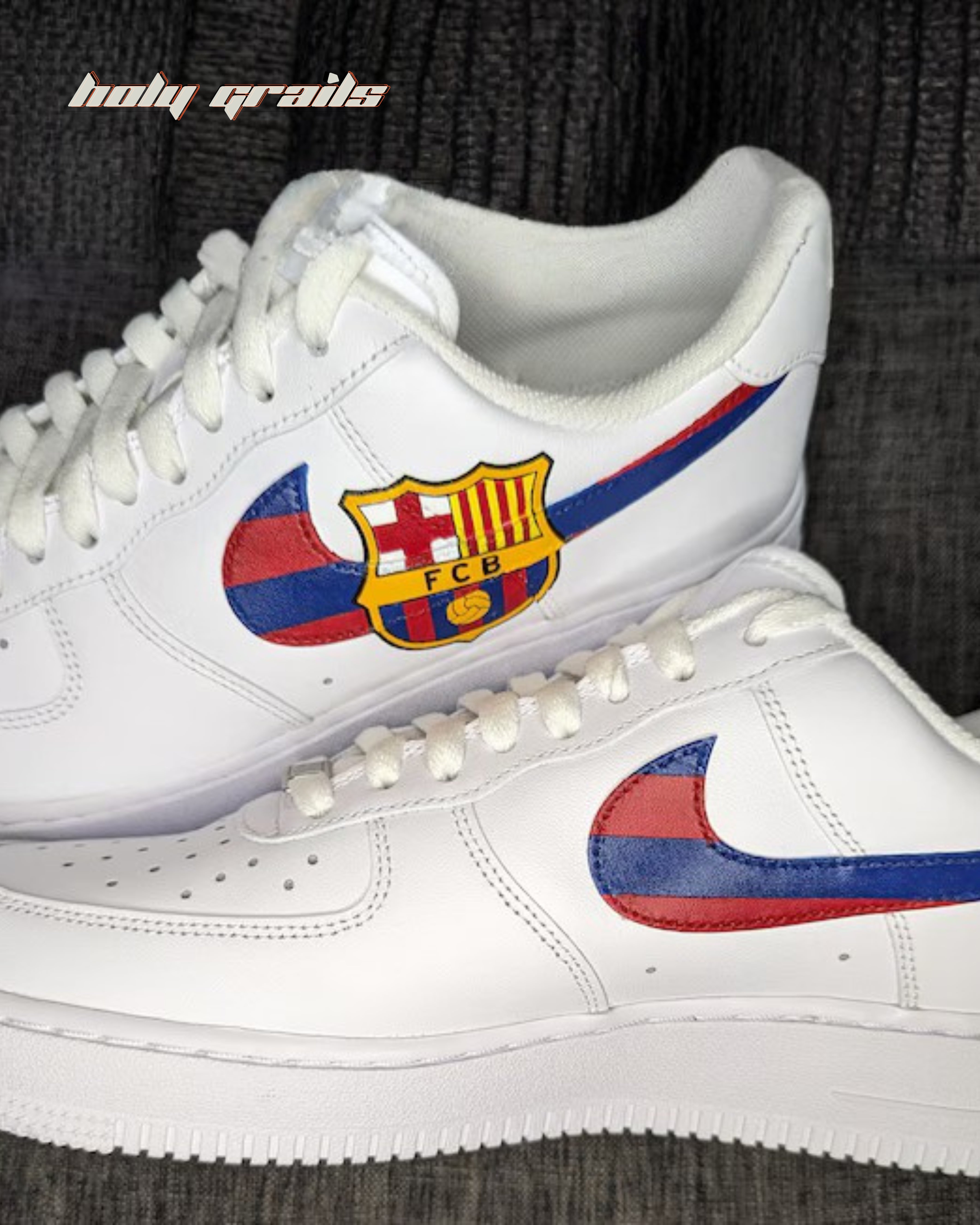 Show your passion for FC Barcelona with these custom Nike Air Force 1 sneakers. The sneaker features the iconic club crest and a bold hand-painted Swoosh in Barça's signature red and blue colors, these shoes combine classic style with team spirit.