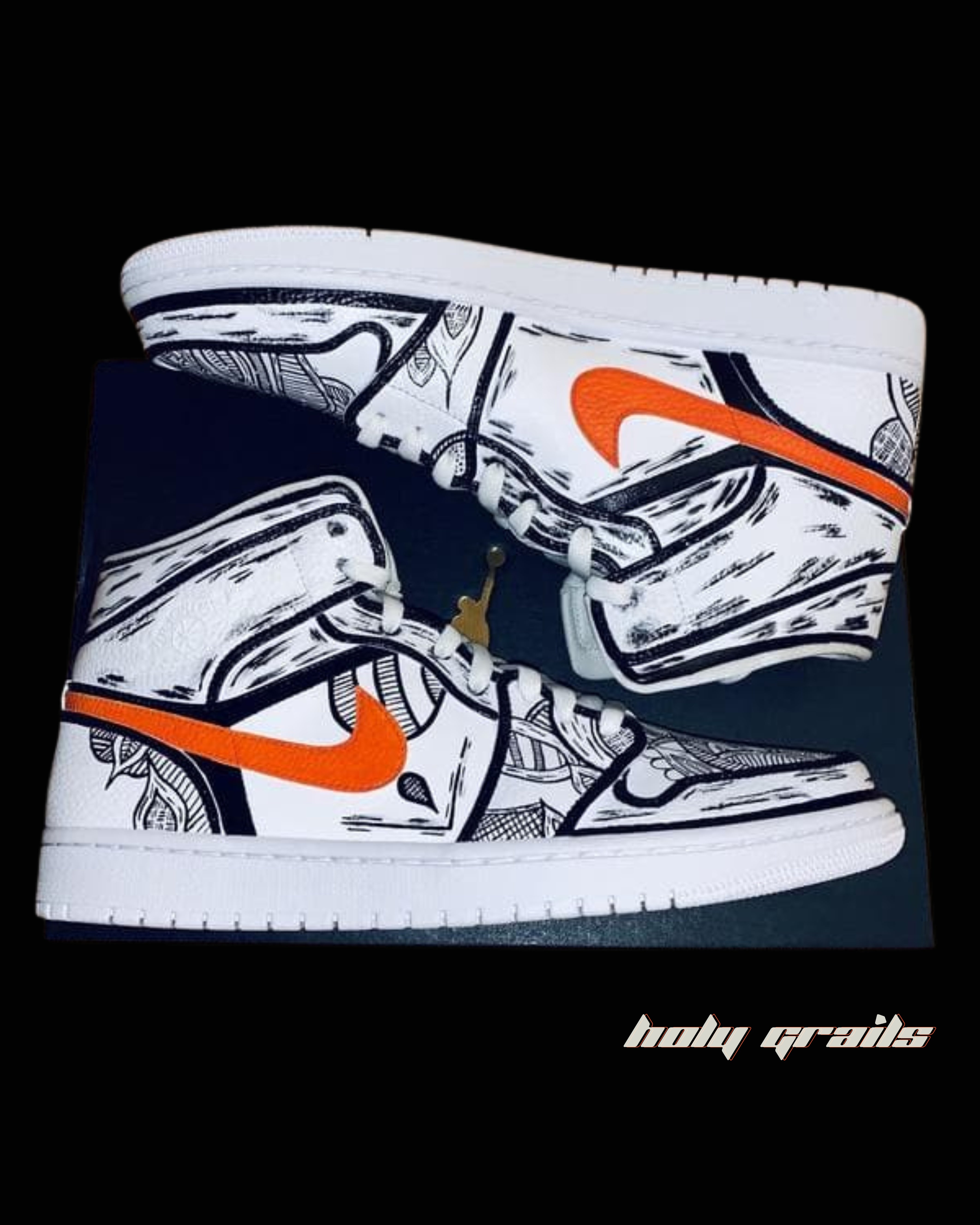 Our custom Air Jordan 1 "Insanity" sneakers, a bold fusion of art and athleticism! These kicks feature intricate, hand-drawn black and white designs, highlighting dynamic patterns and abstract elements. The striking orange Swoosh adds a vibrant pop of color, creating a captivating contrast. Crafted with meticulous attention to detail, each pair is a unique piece of wearable art.
