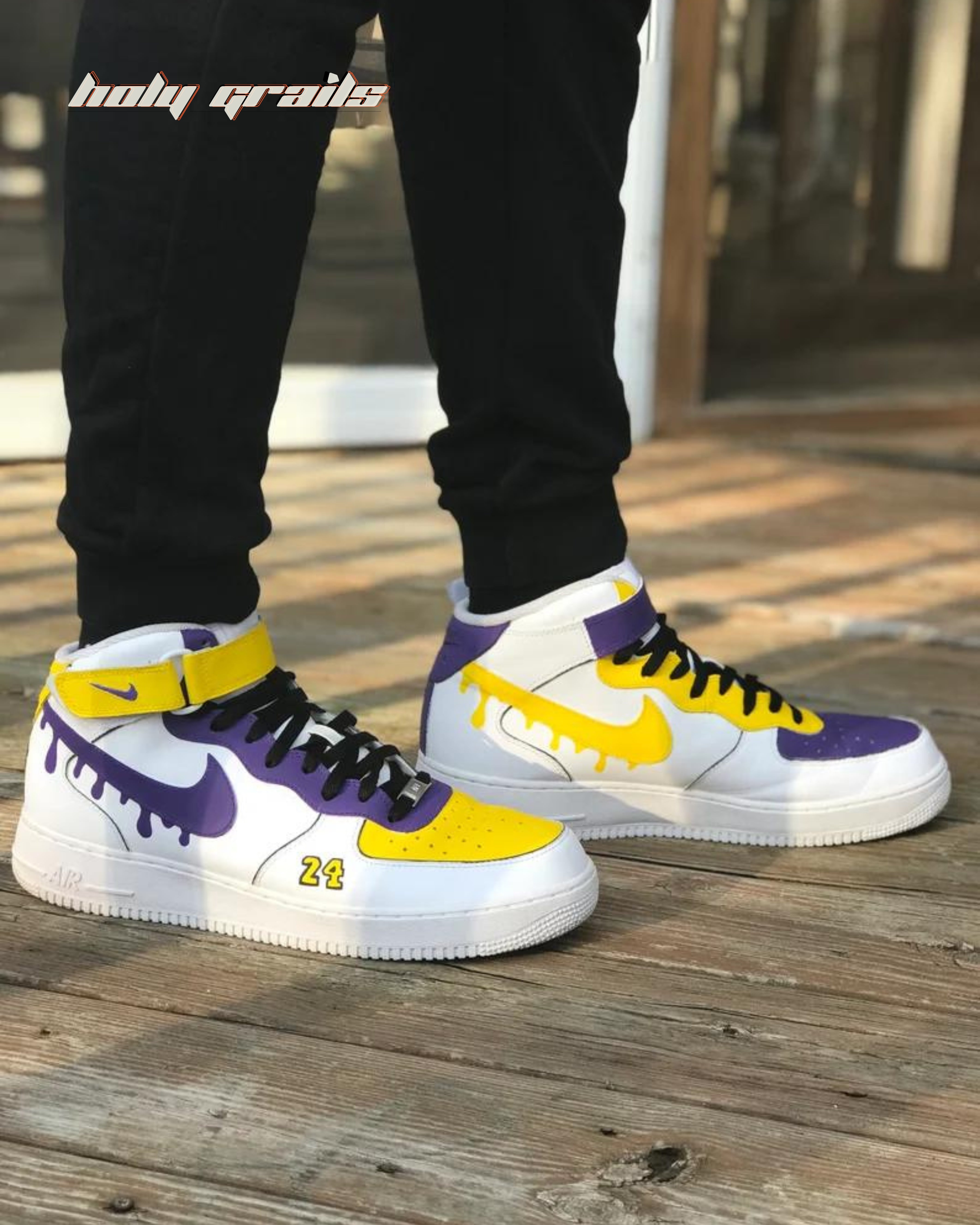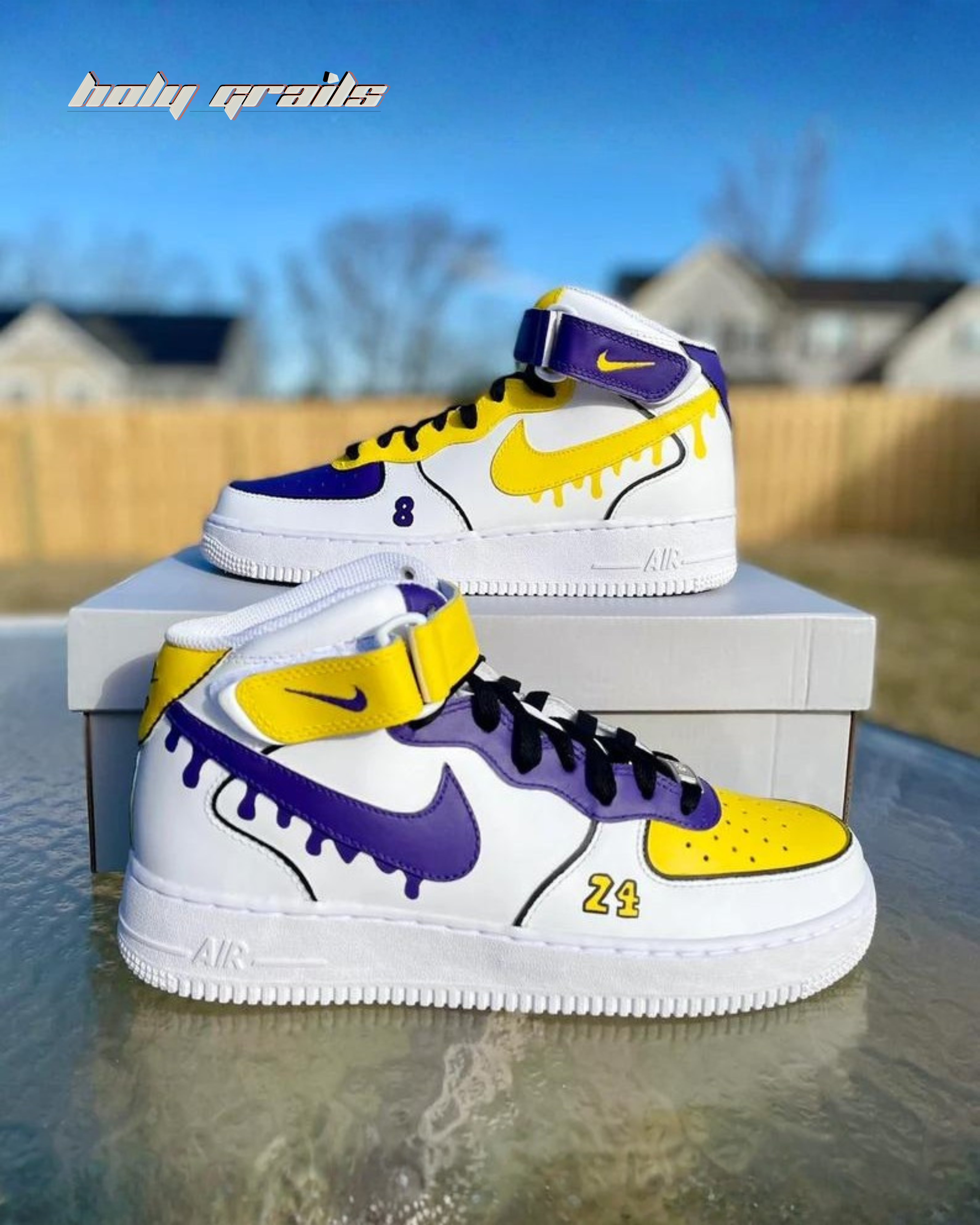 The Lakers custom Nike sneakers feature the signature purple and gold color scheme, these high-top kicks are adorned with unique dripping Swoosh designs and iconic player numbers, "8" and "24," paying tribute to the legendary Kobe Bryant. The meticulous craftsmanship and bold graphics showcase your Lakers pride, making these shoes perfect for any fan. Stand out on and off the court with this exclusive design that combines style, comfort, and a tribute to basketball greatness.