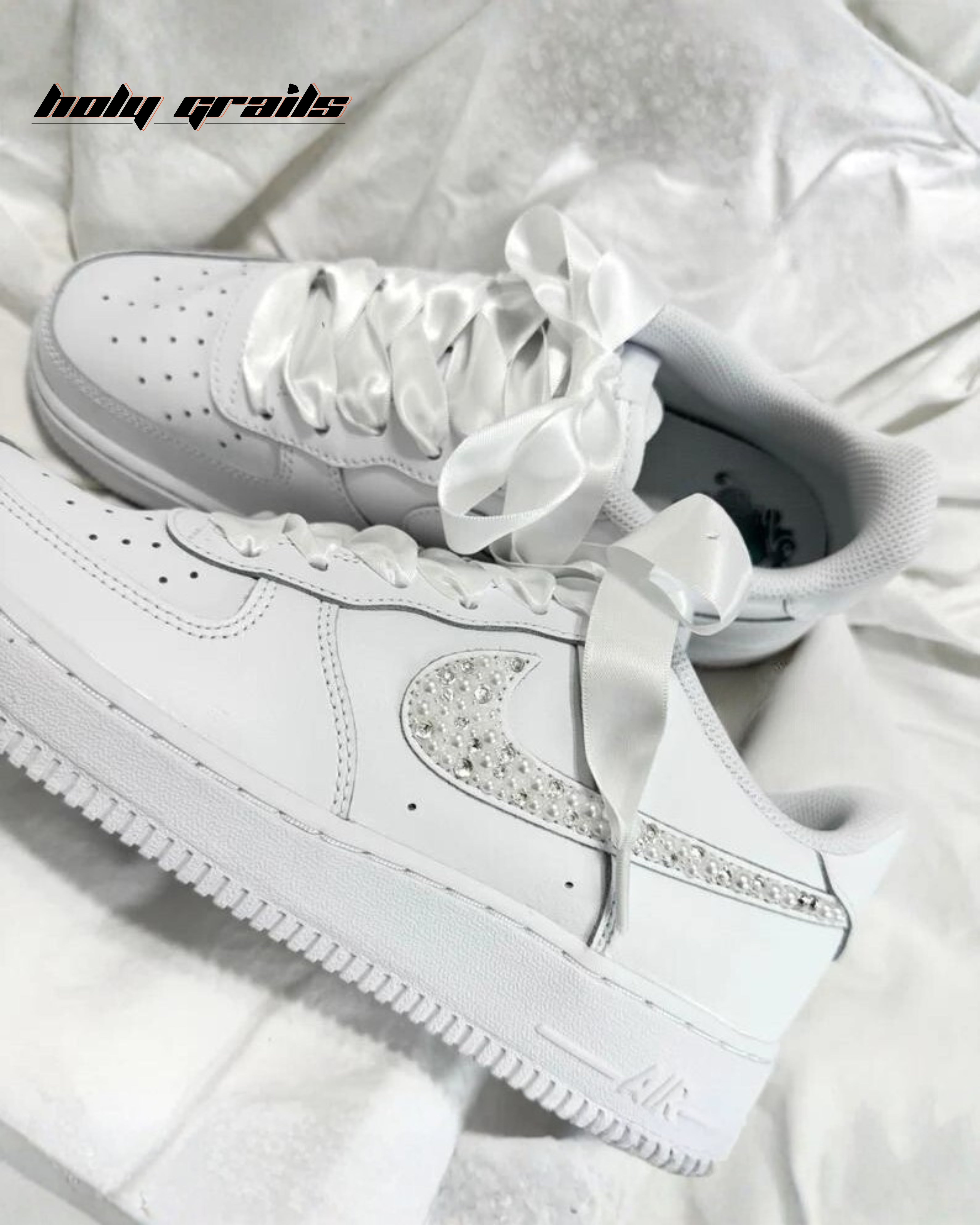 Celebrate your big day in style with these stunning custom Air Force 1 bride sneakers that features delicate pearls on the classic Nike swoosh and personalized with "Mrs. Bride" in elegant script, these all-white shoes combine chic sophistication with unmatched comfort. Finished with graceful ribbon laces, they’re perfect for a memorable wedding day and beyond.