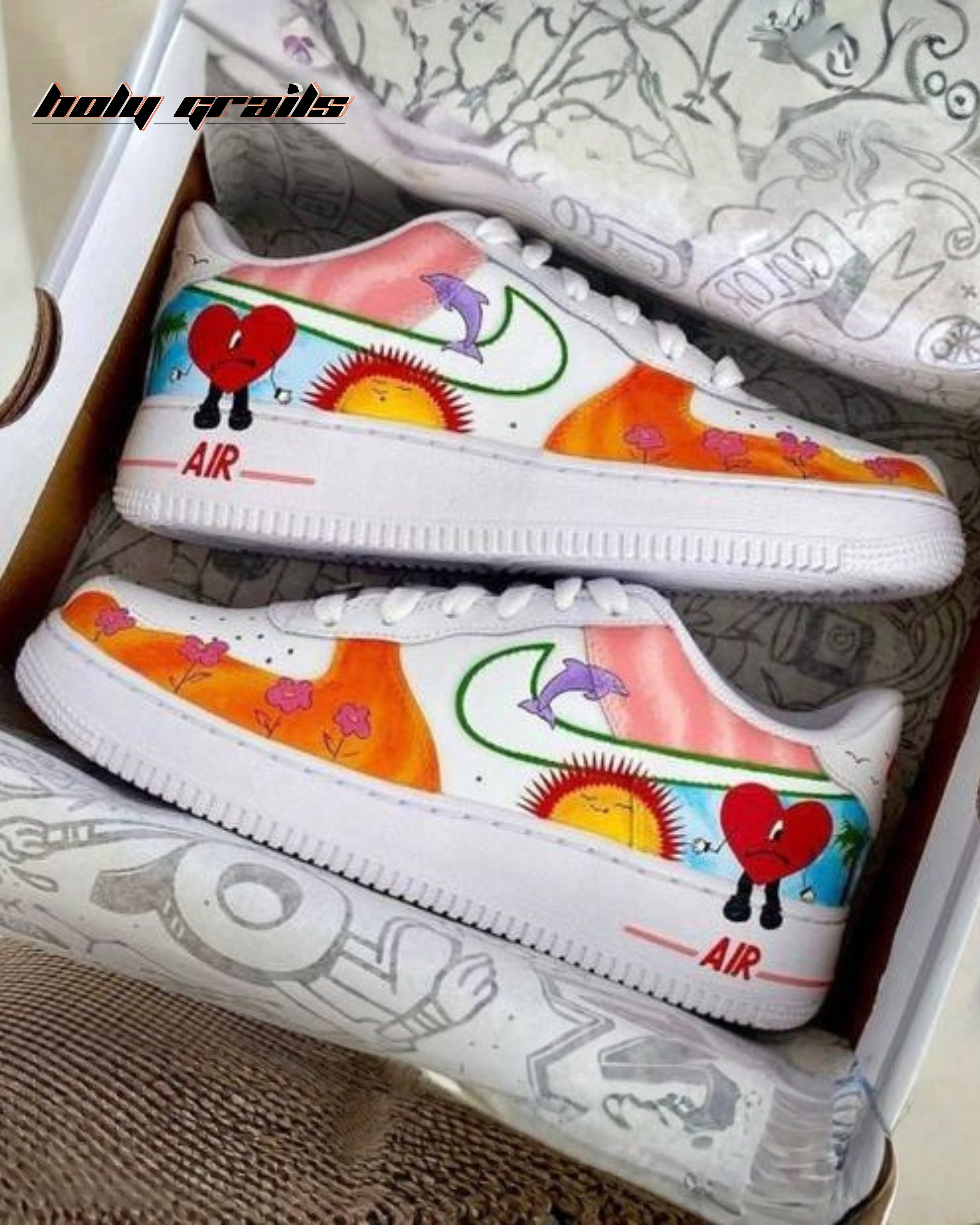 Bursting with vibrant hand-painted artwork, each pair features a whimsical landscape of colorful flowers, radiant sunshine, and a heart-shaped character, blending playful creativity with classic design. The mix of bright hues and intricate detailing transforms these sneakers into a wearable canvas, perfect for those who love to make a statement.