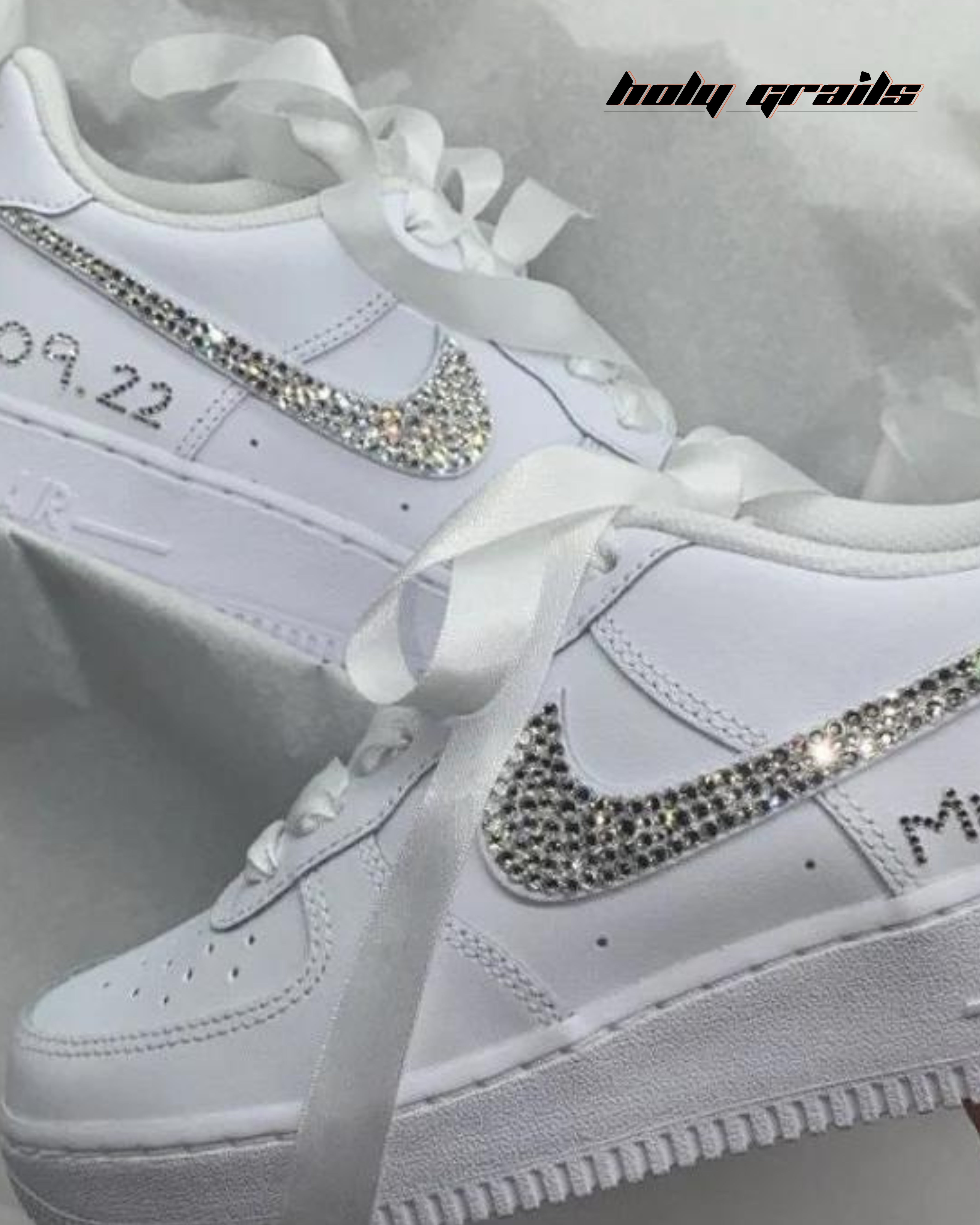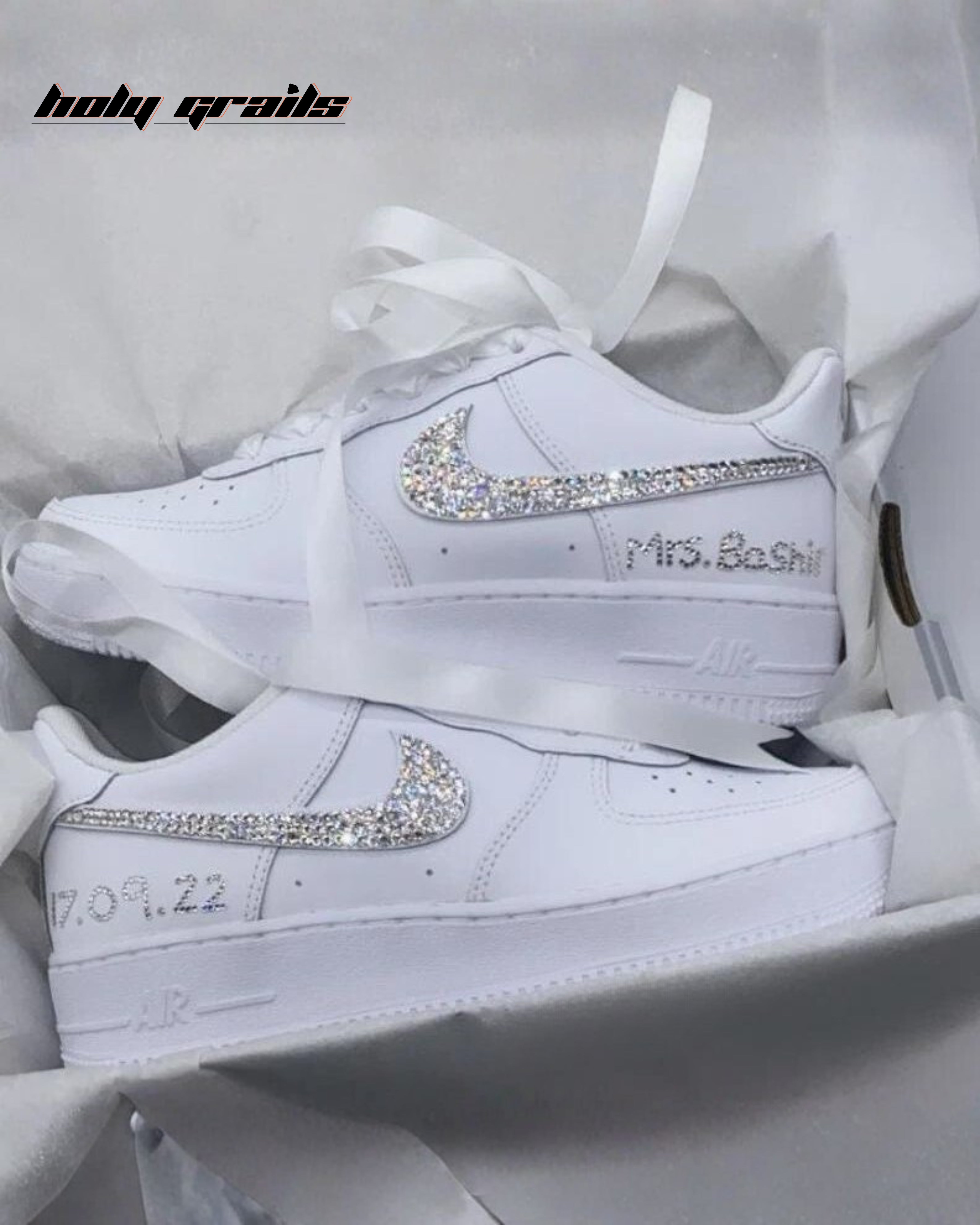 These exquisite custom Air Force 1 bride sneakers are adorned with sparkling rhinestones on the iconic Nike swoosh and personalized details like your wedding date and "Mrs. [Your Name]," these pristine white shoes blend elegance with comfort.
