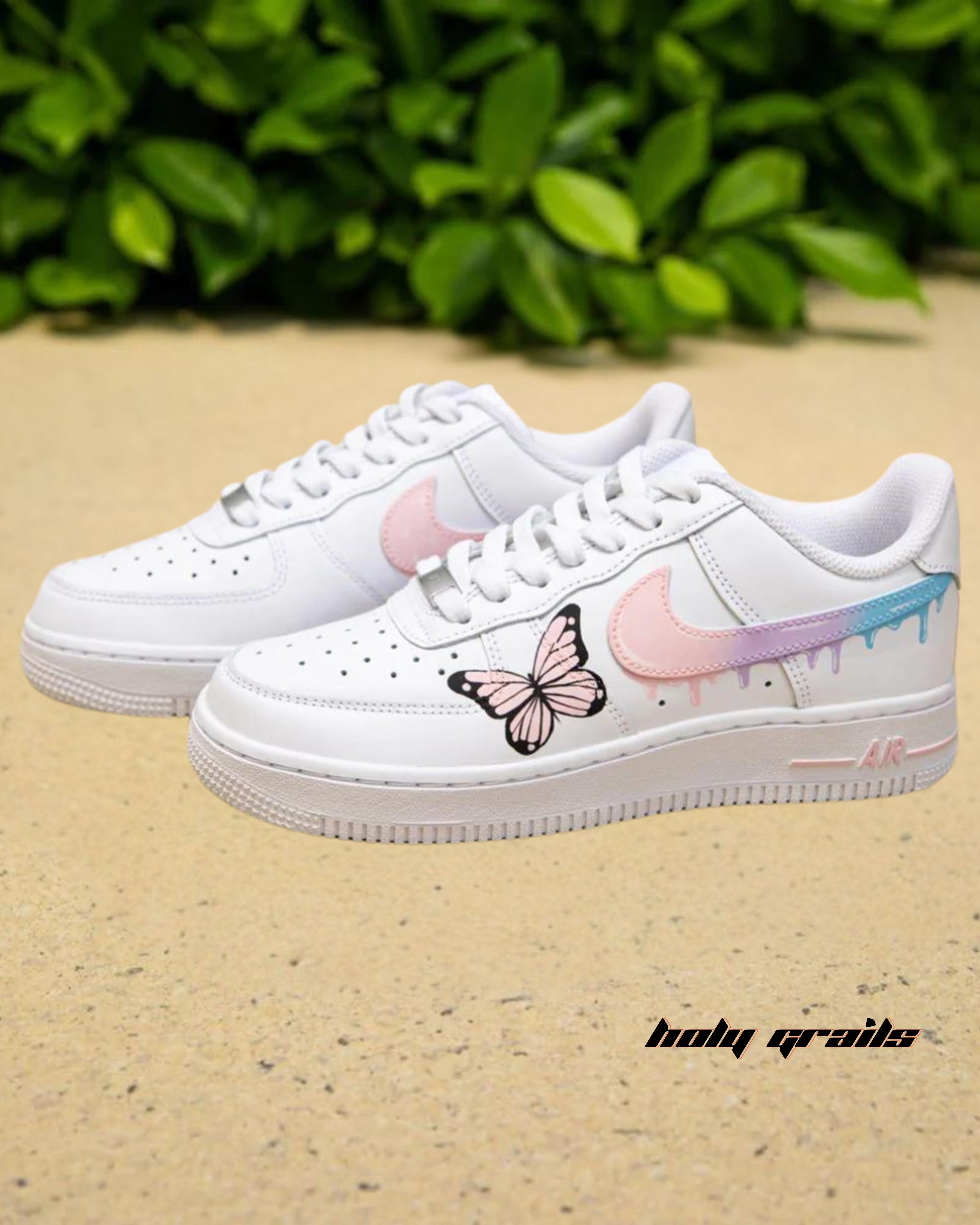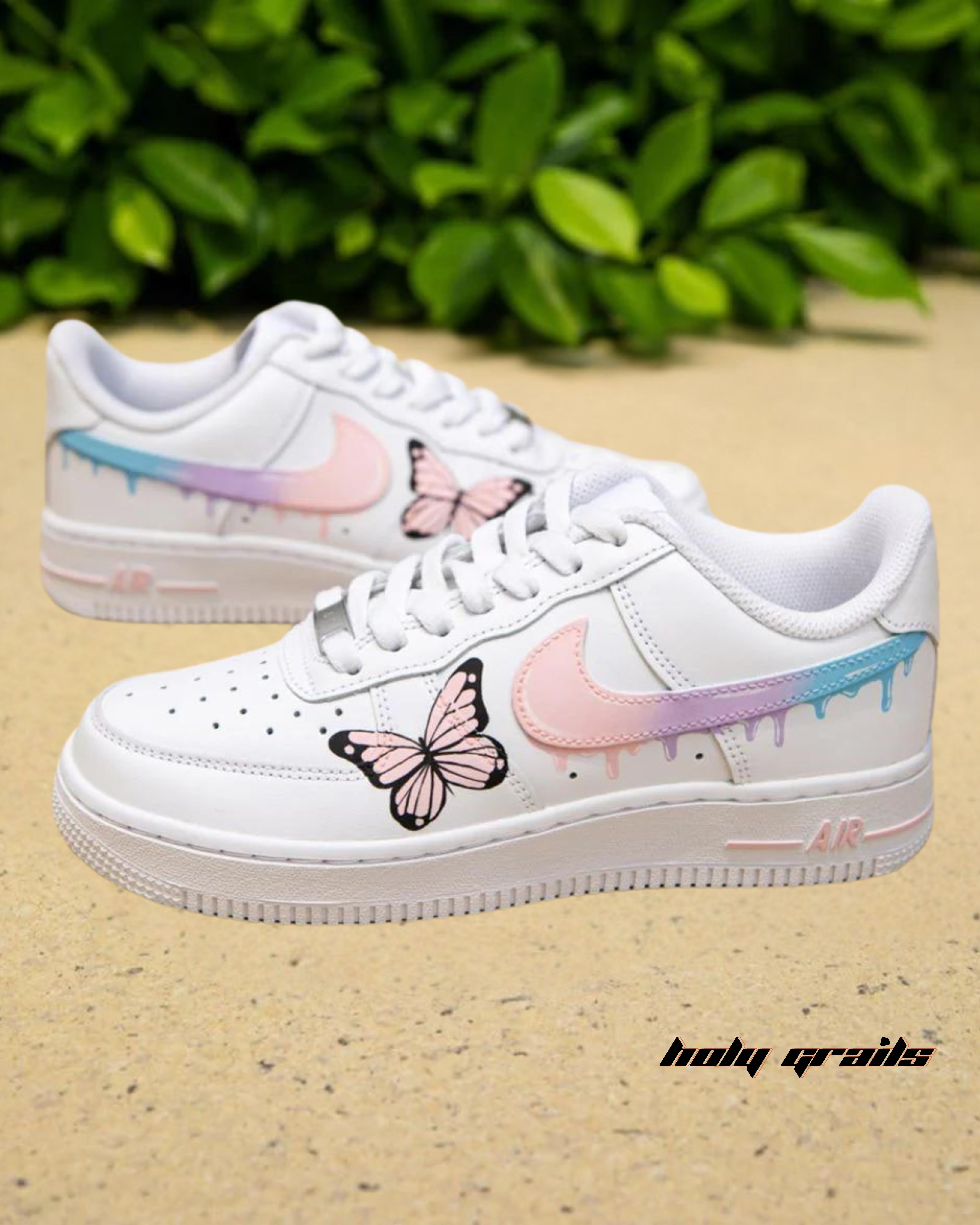 These sneakers are adorned with delicate hand-painted butterflies and pastel drip effects, adding a touch of whimsy and sophistication. The soft pink Nike swoosh complements the artistic details, creating a harmonious blend of style and creativity. Perfect for those who appreciate unique and feminine aesthetics, these custom sneakers offer a fresh, eye-catching look. Embrace your individuality and flutter into fashion with these one-of-a-kind kicks.